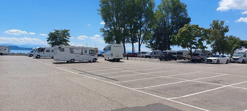 perfecte plek voor campers direct aan het meer...nog even checken of we kunnen slapen...1 frank per uur, zeg maar 1 euro per uur. tis niet anders maar daatvhetv1 augustus is zitten we 1e rang ivm vuurwerkshow ( nat.feestdag)