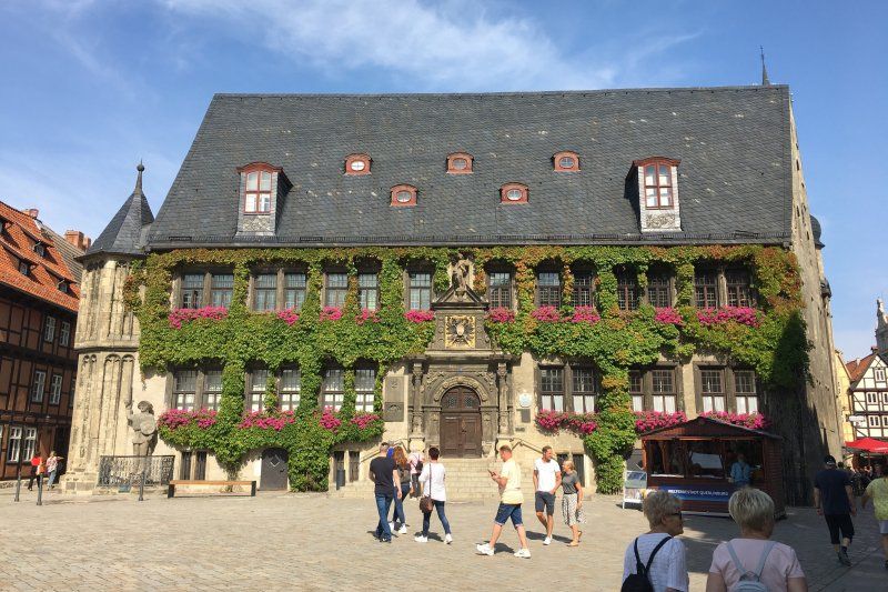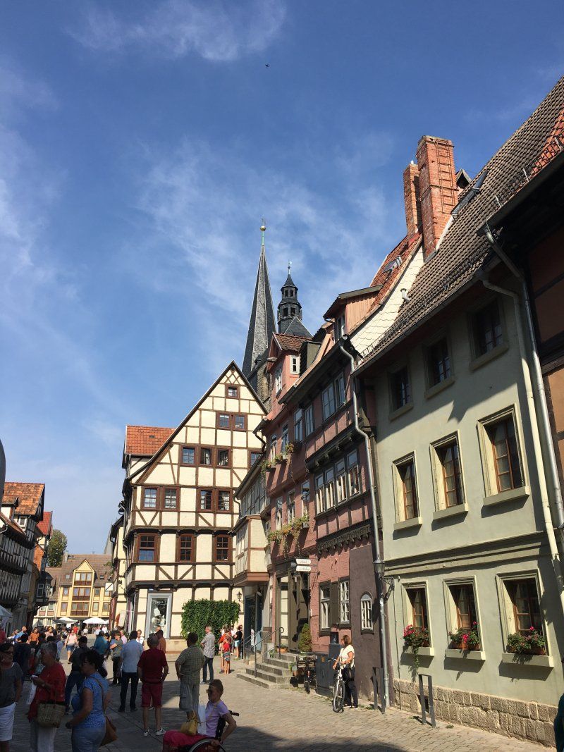 Na onze eerste nacht in onze Sunlight T65 worden we verfrist wakker, ontbijten en vertrekken rond 8.30 uur richting Werelderfgoedstad Quedlinburg. Er zijn meer dan 2000 vakwerkhuizen in deze prachtige stad! We komen rond het middaguur aan, zoeken een parkeerplaats en vinden uiteindelijk wat we zoeken in het Marschlinger Hof. Dit is een parkeerplaats en een Womo-parkeerplaats die 15 € per dag kost. We hebben geluk, er rijdt iemand weg en geeft ons zelfs een geldig parkeerbewijs! In een paar stappen zijn we in de werkelijk prachtige oude stad.