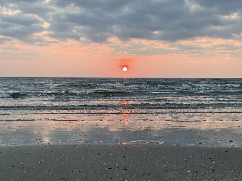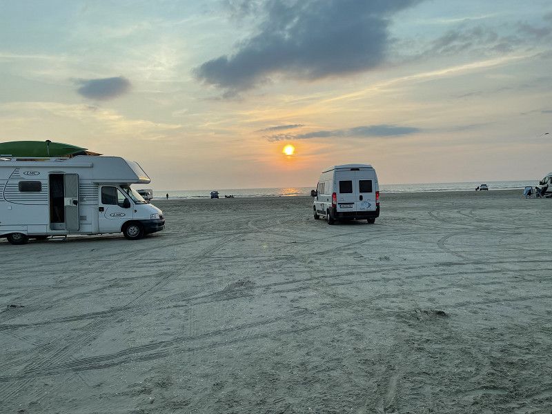 Stranddag bij autostrand Romo - rijd met de camper direct naar het water en zwem, kook, geniet van de dag en daarna van de zonsondergang boven zee.