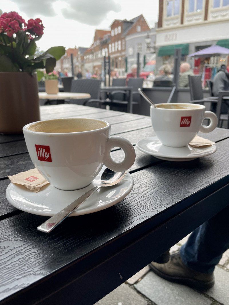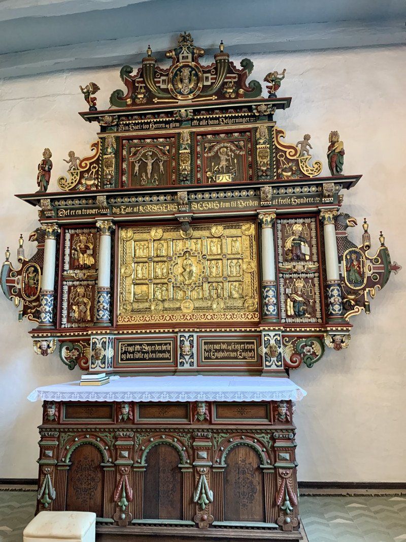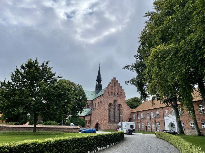 We rijden via de snelweg naar Vaested, een leuk plaatsje en parkeren voor de bioscoop. Aan de overkant is de kerk en die bezoeken we. Mooi hoor! Lopen het stadje in en drinken bij de markt een bak slappen koffie. Koffie is erg duur (vind ik) in Denemarken. Maar soms wil je het gewoon. Nadat we bij de damper terug zijn stappen we weer in en rijden richting Mons klant. Via de margrietroute, mar dat is niet altijd even makkelijk. In Praesto gaat het zeker mis en we rijden 3 keer een rondje. Dan maar zelf navigeren naar het volgende plaatsje.