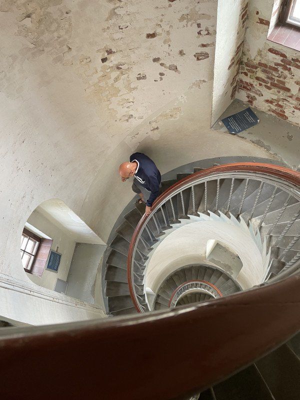 Door gaat het naar Mons klint. Het is een avontuurlijke route, niet geasfalteerd, steil (15% bij tijden) en smal. Maar we halen het en parkeren de camper. We wandelen naar de klif. 325 treden later hebben we een prachtig uitzicht op de klif zelf. Blij dat we niet naar beneden zijn gegaan, want het is behoorlijk steil zeg.